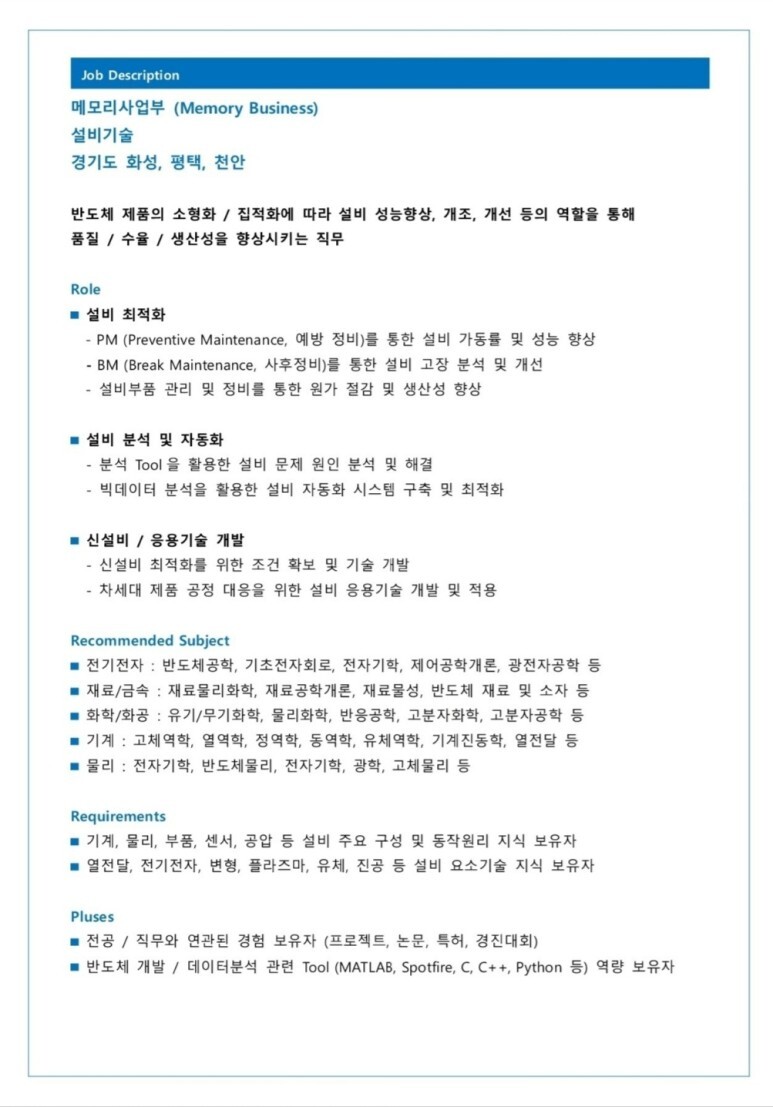 저 나름의 요약을 해보자면 반도체 설비 유지 및 보수, 설비 분석을 통한 문제 원인 분석과 해결능력 + 신체 건강하고 교대 근무를 원활하게 할 수 있는 분이시면 좋을 것 같습니다.