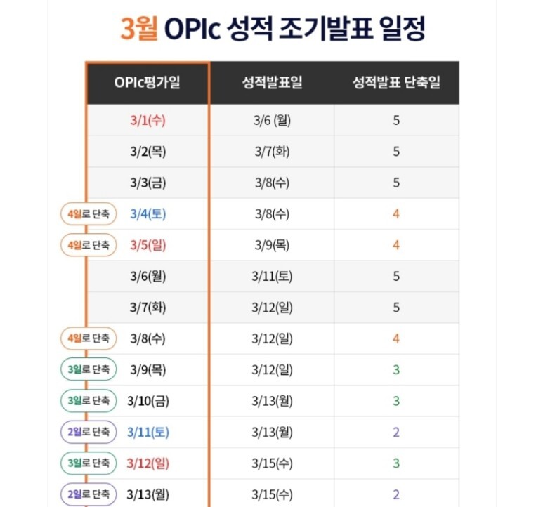 3월 오픽에서는 성적 조기발표를 시행하는데요 일정은 아래와 같습니다.